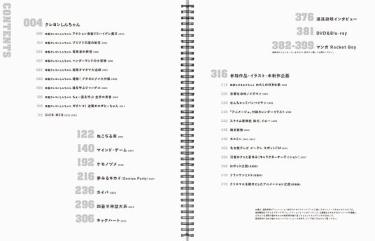 『クレヨンしんちゃん』『ちびまる子ちゃん わたしの好きな歌』『ねこぢる草』『マインド・ゲーム』『ケモノヅメ』『夢みるキカイ』『カイバ』『四畳半神話大系』『キックハート』ほか、まだ監督デビュー前の20代から20年以上にわたって描かれた貴重なキャラクターデザイン、世界観設定などの膨大なカラースケッチ約900点を監督本人の詳細コメントとともに網羅的に収録!