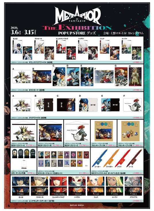 2026年3月6日(金)より上野マルイにて、「メタファー:リファンタジオ展」のPOPUP STOREを開催いたします。展覧会でしか手にできなかった商品を、実際に手にとって購入できる初めての機会となります。POPUP STOREで展覧会の興奮をもう一度!