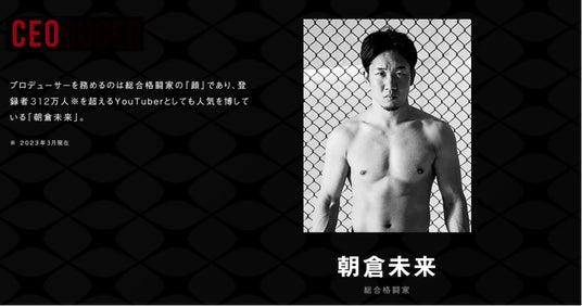 登録者数345万人超え(2025年6月現在)の人気YouTuberでもある総合格闘家の朝倉未来がCEOを務め、スペシャルアドバイザーとして総合格闘家の朝倉海、総合格闘家の白川陸斗が参画しています。