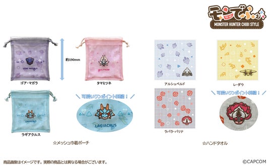 「モンスターハンター」シリーズに登場するモンスターを「ぬいぐるみ」タッチで描いた、かわいいデフォルメシリーズの新作の予約開始! メッシュ素材の巾着ポーチ、ワンポイント刺繍入りのハンドタオルがラインナップ! メッシュ素材の巾着ポーチ、ワンポイント刺繍入りのハンドタオルがラインナップ!