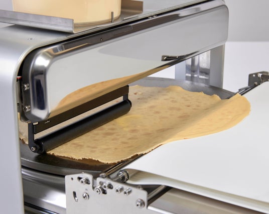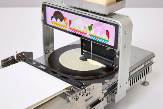 高性能ロボット技術で、自動できれいな円形のクレープ生地が出来上がり!
