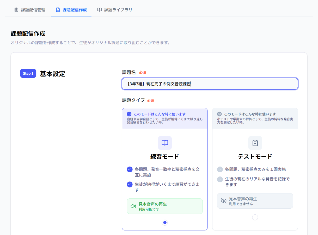 課題作成画面:宿題や自主学習などに適した「練習モード」、小テストなどに適した「テストモード」の2種類