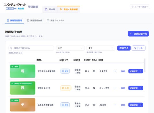 教員専用の管理画面では、「英会話」機能同様、課題配信や児童生徒の学習状況を確認できます。