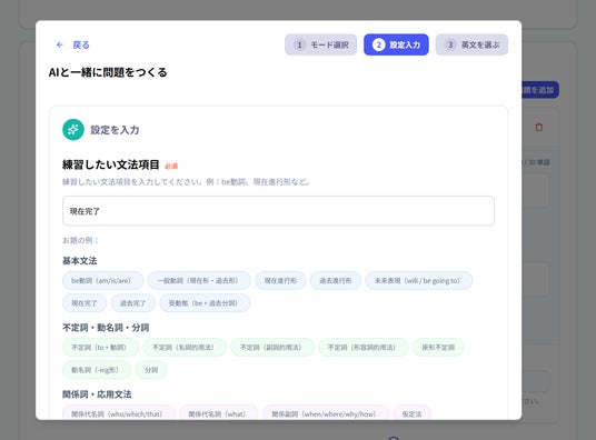 教員が音読・スピーキング用コンテンツを課題として作成し、学年・クラス単位で児童生徒へ配信できます。AI によるオリジナル問題の自動生成にも対応しており、単語や文法項目を指定するだけで、適切な難易度の英文が候補として提示されます。