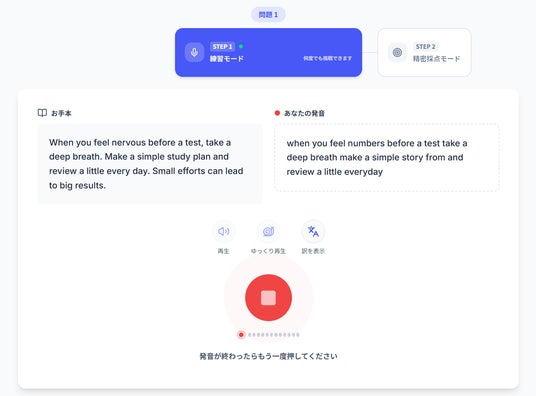「もっと声に出して練習させたい。でも時間が足りない。」──多くの先生方からいただいてきたこの声に応えるため、当社は AI によるリアルタイム採点とフィードバックを軸に、生徒がいつでもどこでも英語を「話す」練習ができる環境を開発いたしました。