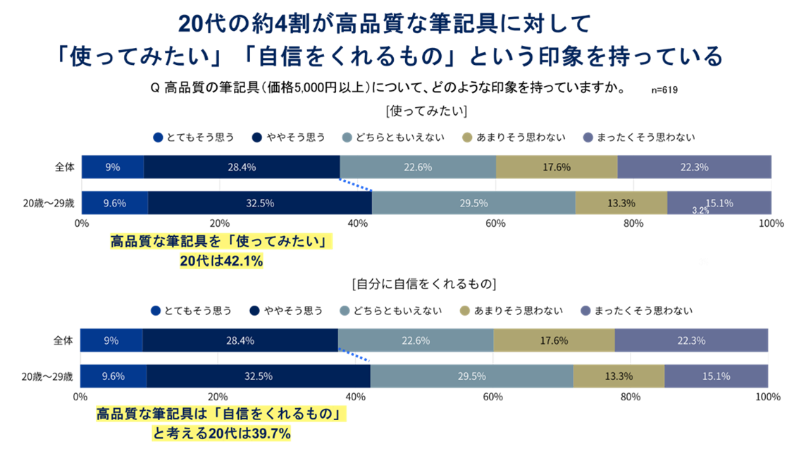 さらに、20代の約4割は高品質な筆記具は「自分に自信をくれるもの」と捉えていること も明らかに。