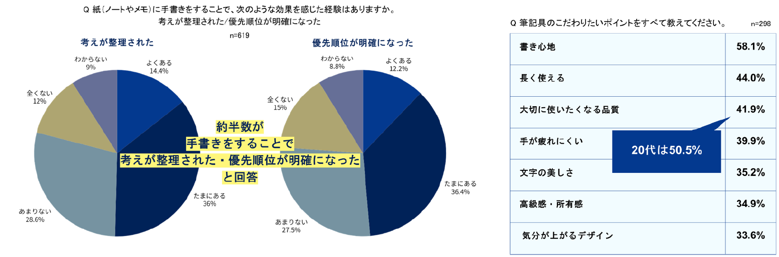 紙のノートやメモに手書きをすることについて「考えが整理された」が50.4%、「優先順位が明確になった」が49.1%と、約半数が効果を感じていることが明らかになりました。