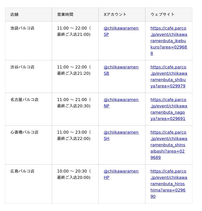 「ちいかわラーメン豚」店舗情報