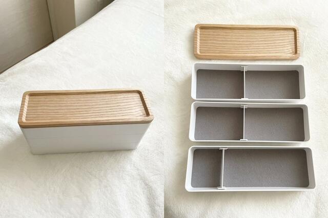 よく使うものの中からその日の気分で選びたい人は、木目トレーに複数をのせておくも良し、蓋だけを外して別の場所で活用するも良し。自分のスタイルに合わせて、自由な使い方ができるのも魅力です。