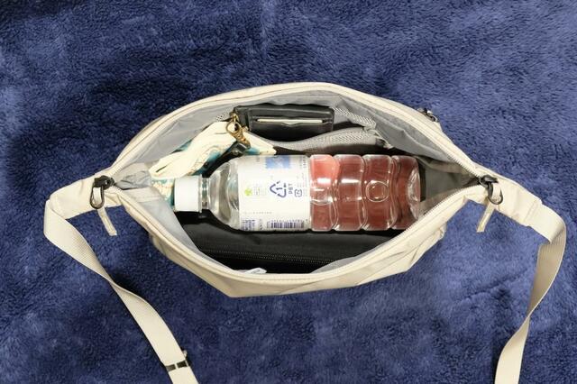 容量は5Lのコンパクトショルダーで、500mlのペットボトルやマイボトル、タブレットも収納できちゃいます。