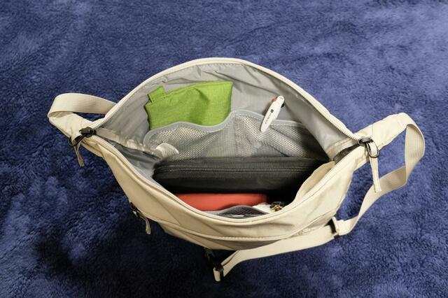 2L程度のミニバッグやサコッシュでは入り切らないペットボトルや、折りたたみ傘を収納できるのに大げさにならない。