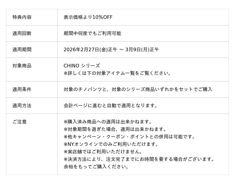 期間中、対象のチノパンツと、対象のシリーズ商品いずれかをセットで購入すると10%OFFとさせていただきます!大人の「チノ」再定義。パンツと小物で完成するトラッドスタイルをぜひお楽しみください。