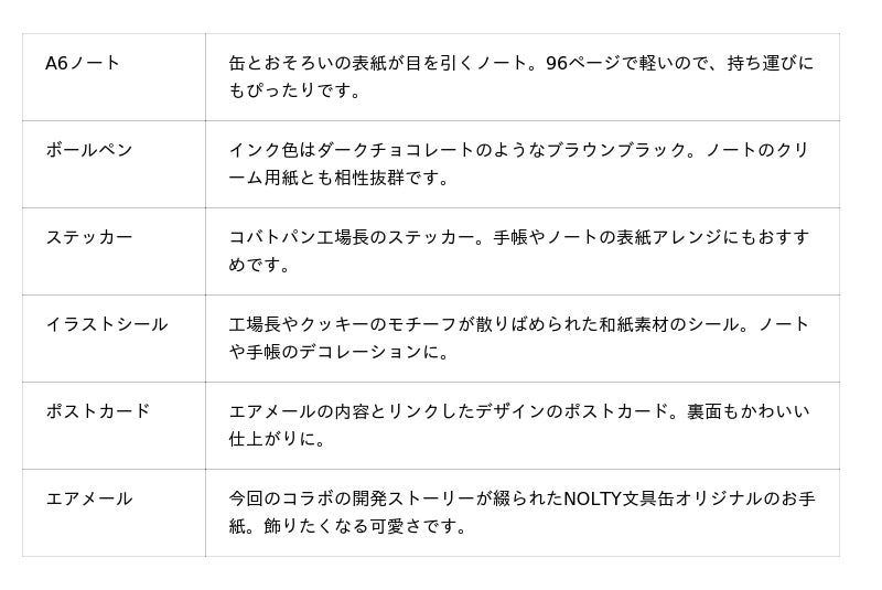 手帳ブランド「NOLTY」が展開するノートシリーズNOLTY notebook。手帳づくりのノウハウを活かしたNOLTY notebookと、大阪で大人気のコッペパン専門店「コバトパン工場」がコラボレーション。コッペパンはもちろん、レトロなデザインの缶でも注目を集める同店ならではの世界観が文房具になりました。NOLTYのロゴが入った限定デザインの「文具缶」をはじめ、ノートやリフィルなど文具好きの心をくすぐるバラエティ豊かなラインアップをご用意しています。普段は大阪の店舗やオンラインでしか購入できないコバトパン工場のアイテムを、実際に手に取ってご購入いただける貴重な機会です。