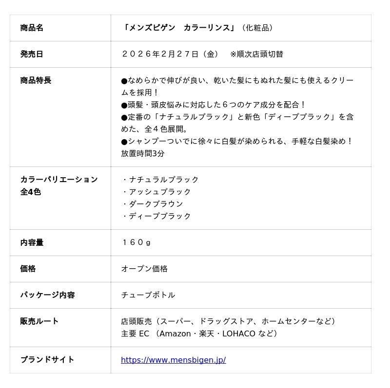 ホーユー株式会社(本社:愛知県名古屋市、代表取締役 社長執行役員:佐々木 義広、以下ホーユー)は、白髪男性市場の拡大と更なる顧客満足度向上を目指し、男性白髪染め市場売上No.1※を誇るメンズビゲンブランドから「メンズビゲンカラーリンス」を2026年2月27日(金)よりリニューアルいたします。