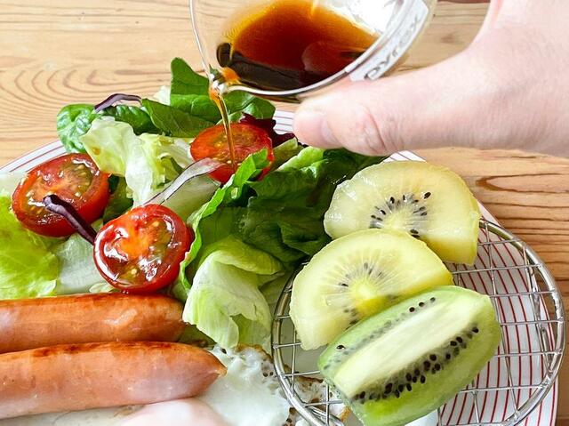 揚げ物以外にも、サラダのドレッシングがほかの料理と混ざらないようにしたいときも、盛付あみの出番です!