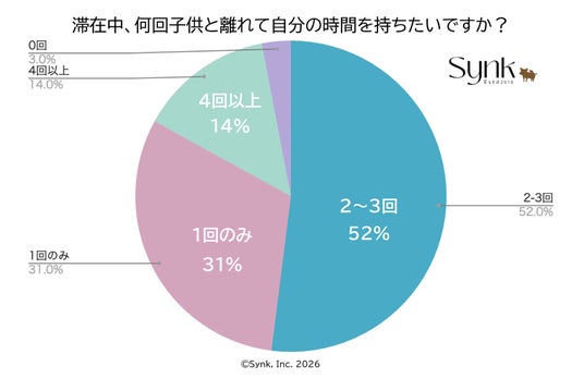 「訪日期間中、ME TIMEを確保するために託児サービスを何度利用したいか」という質問に対し、52%が「2~3回」、14%が「4回以上」と回答し、合わせて66%が複数回の利用を想定しています。