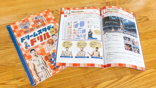 ドリームスタディドリルには、キングスの選手やマスコットの「ゴーディー」が登場し、沖縄市の名産品や伝統芸能であるエイサーなど、子どもたちが暮らす地域への関心を深めながら、身近な話題を通じて楽しく学べる内容となっています。また、国語や算数といった教科の学習に加え、#14 岸本隆一選手の「夢をつかめ」というメッセージが込められたポスターや、ゴーディーのペーパークラフト貯金箱も教材の付録として付いています。