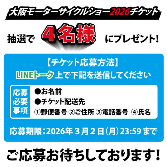本キャンペーンでは、CAMSHOP.JP公式LINEを通じてご応募いただいた方の中から、抽選で4名様に大阪モーターサイクルショー2026の入場チケットをプレゼントいたします。