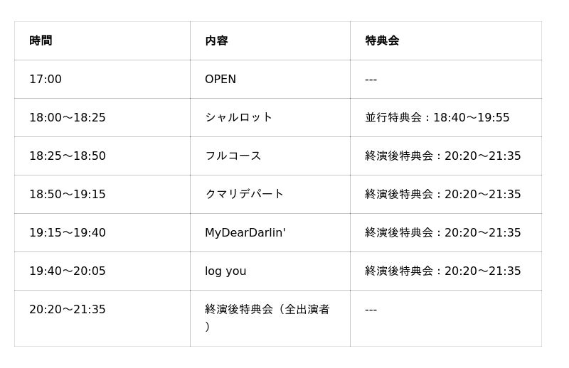 ※シャルロットのみライブ公演と並行して特典会を実施。その他4組の特典会は終演後(20:20~21:35)に実施します。