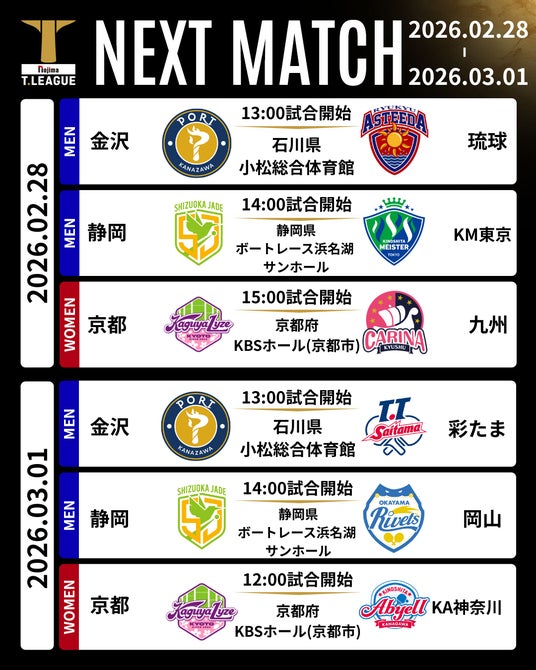 日曜の対戦となるKM東京は、この試合勝利をすればプレーオフ進出(レギュラーシーズン3位以内)が決まる。先週、Tリーグデビュー戦で勝利をあげたチャン ユーアンや、成長著しい川上流星といった若い選手達が大事な場面で起用があるかに注目したい。