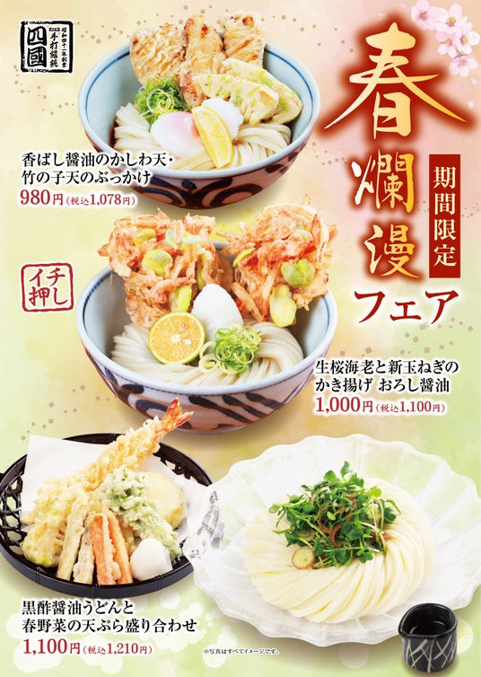 北海道・大阪・兵庫で営業しています「饂飩の四國」では3月2日(月)より春の旬な食材をふんだんにトッピングしました季節限定メニュー3種類を発売いたします。サクサク食感の生桜海老と新玉ねぎのかき揚げをのせた「生桜海老と新玉ねぎのかき揚げ おろし醬油」に春の味覚の天ぷらをふんだんに載せた「黒酢醤油うどんと春野菜の天ぷら盛り合わせ」そして、甘めの醬油たれ風味のかしわ天に磯辺揚げにした竹の子天を載せた「香ばし醤油のかしわ天・竹の子天のぶっかけ」でございます。この機会に旬な美味しさをお楽しみください。皆さまのご来店をスタッフ一同お待ちしております。