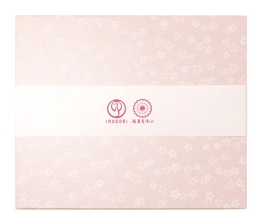 「鶴屋吉信」からは、「IRODORI」ブランド限定の人気商品、桜のかたちに3種のフレーバーをこめた「桜琥珀糖」を。可愛い桜の小花柄をあしらった、特製の意匠箱にお詰合せいたしました。