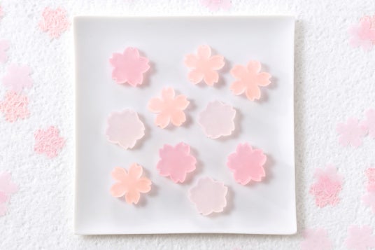 中はつるりとやわらかく、表面は糖化してしゃりっとした薄い層ができるのが特徴です。純国産寒天を使用し、伝統の製法で桜の花々をあらわした琥珀糖に、ピーチ・チェリー・さくらの3種の風味をこめました。