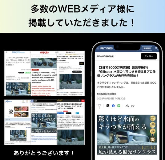 「クラファン3日で1,000万円突破」──釣り×アウトドア愛好者必見の高性能偏光サングラスとして掲載。反射を抑え、紫外線99.9%カットの高性能レンズ設計に注目が集まりました。