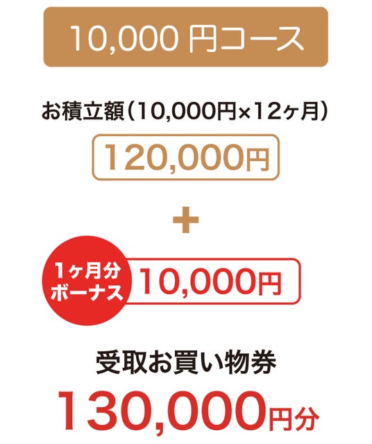 毎月10,000円を1年間積み立た場合、ボーナスとして1ヶ月分の積立金がプラスされ、満期時には130,000円分の「お買物券」をお渡しします!