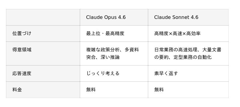 行政現場のリアルは、「毎日の問い合わせ対応や文書作成」がSonnet、「計画書の突合や政策の深堀り」がOpusという使い分けです。QommonsAIは両方を無料で使い放題にすることで、職員の方々がモデル選択で迷わない環境を実現します。