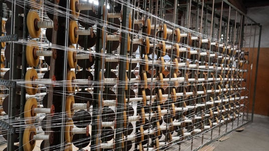 織機に糸を通している様子