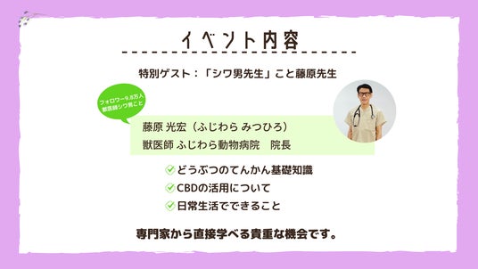 本イベントは、てんかん啓発活動の日「パープルデー(3月26日)」に合わせて開催するもので、今年で4回目となります。獣医師“シワ男先生”こと、ふじわら動物病院院長:藤原光宏先生とペット栄養管理士のヒロミカさんをゲストに迎え、てんかんの基礎知識や食事・栄養の考え方、日常生活でできるケアについて、飼い主の視点に寄り添いながら分かりやすく解説します。