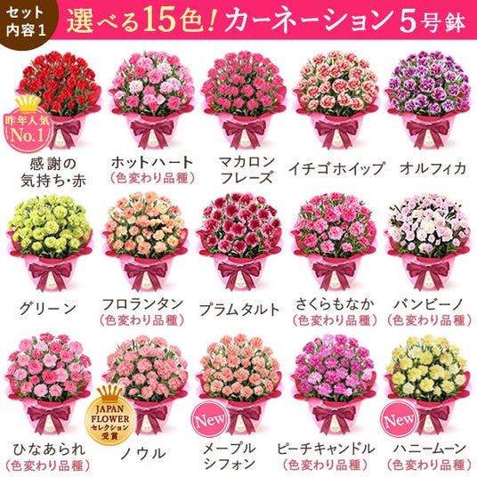 選べる15色のカラーバリエーションお母さんの好みや雰囲気にあったカーネーションを選びたいというお声から、毎年豊富なカラーバリエーションをご用意。2026年新作カラーにも注目です。