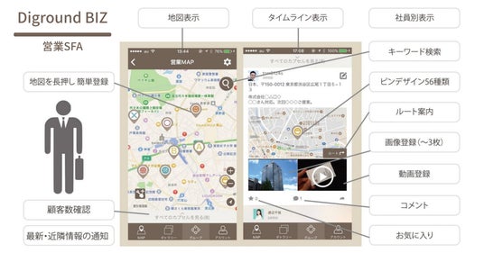そして、観光案内や地域イベントに特化したサービス「Diground EVENT」と、地図上で顧客管理ができる営業マン向けのSFA・CRMサービス「Diground BIZ」の2つの事業者向け派生サービスが誕生しました。