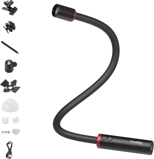 RM 03 LEDライト アームライト マクロ撮影用 5480SmallRig RM 03マクロライトは、4°から32°までのビーム角度調整が可能で、簡単かつ正確なポジショニングを実現します。屋外撮影には、トランクに巻き付けたり、底面の1/4インチネジ穴で三脚に接続したり、地面に杭を打ち込んだりして設置できます。IP54で屋外でも安心。3Wの高輝度LEDランプ5個(冷白色、温白色、赤、緑、青)、CRI 95、TLCI 92を搭載。冷光は6500K、温光は2200Kです。