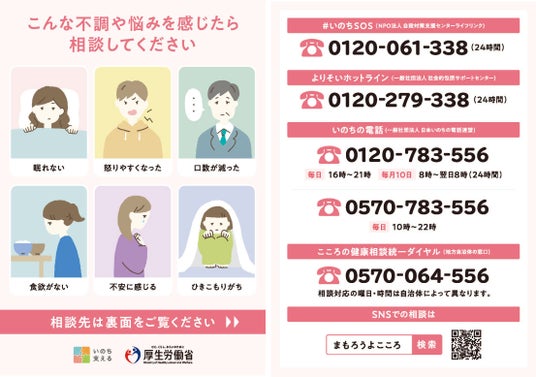 厚生労働省(所在:東京都千代田区)は、毎年3月の「自殺対策強化月間」において、関係府省庁等と連携し自殺対策に関する国民の理解を深めるための啓発活動や、悩みを抱えた人に対する各種相談事業の周知活動を強化しています。