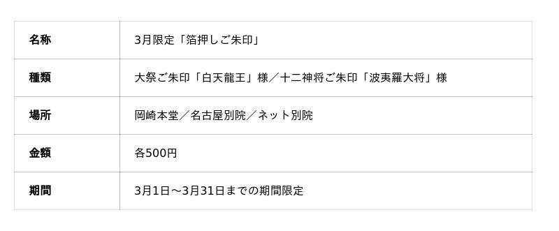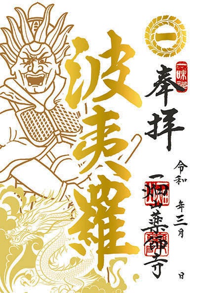 一畑山薬師寺の月替わり限定ご朱印の3月限定ご朱印が公開。「大祭ご朱印」から白天龍王様、十二神将ご朱印から波夷羅(はえら)大将様の計2種類です。