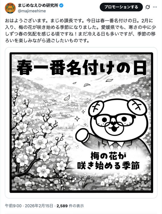 愛媛県では、「まじめ」をキーワードに県内の魅力を伝える、「まじめえひめ」プロジェクトを実施しています。まじめえひめ公式Xでは、愛媛の「まじめ」な魅力を多くの人に届けたいと思った、「まじめえひめ」イメージキャラクターである“まじめ課長”がアカウントの運用を担当し、知る人ぞ知る愛媛県の情報やイベント情報などを毎日投稿しています。