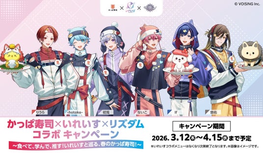 コロワイドグループのかっぱ寿司(カッパ・クリエイト(株)本社:神奈川県横浜市、代表取締役社長:山角 豪)は、2026年3月12日(木)より、2.5次元アイドルグループ 「いれいす」、そしてゲーム型英語学習アプリ「Risdom(リズダム)」(※1)とのトリプルコラボキャンペーン「食べて、学んで、推す!いれいすと巡る、春のかっぱ寿司!」を全店にて開催いたします。