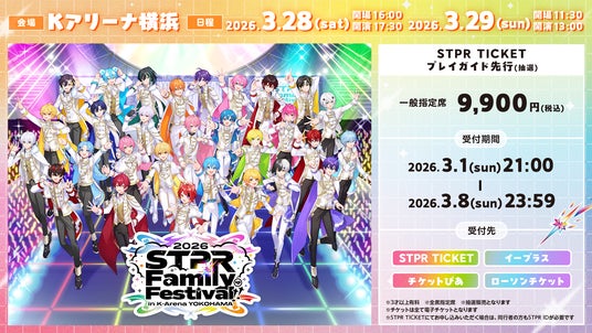 株式会社STPR(本社:東京都渋谷区、代表:柏原真人、以下「STPR」)は、当社所属の2.5次元アイドル・歌い手グループ「すとぷり」「Knight X - 騎士X -」「AMPTAKxCOLORS」「めておら - Meteorites -」「すにすて - SneakerStep Prod.STPR MUSIC」が出演する大型ライブイベント『STPR Family Festival!! 2026』(Kアリーナ横浜/2026年3月28日(土)・29日(日)開催)について、2026年3月1日(日)21:00より、チケットの「STPR TICKET・プレイガイド先行(抽選)」受付を開始したことをお知らせいたします。