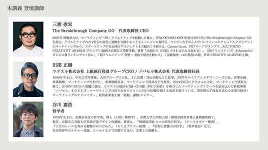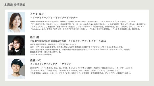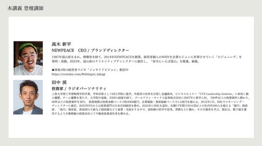 ビジネスシーンの先端で活躍し続けている経営者やクリエイターにご登壇いただき、本講座を受講することで得られる考え方や手法などを対談形式で解説します。ぜひお気軽にご参加ください。