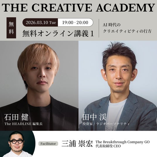 株式会社GO(本社:東京都港区、代表取締役:三浦崇宏)は、AI時代に求められる“創造的思考力“と”突破力“を鍛える教育プログラム「THE CREATIVE ACADEMY 2026 1st 超実践コース」を、2026年4月9日より開講。本日3月2日より募集を開始することをお知らせします。