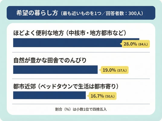 もし移住するなら希望する暮らし方(最も近いものを1つ)を聞いたところ、最多はほどよく便利な地方(中核市・地方都市など)で28.0%(84人)でした。