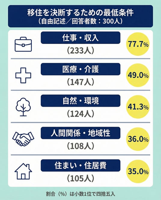 これらの結果から、移住への関心は一定程度広がっているものの、実際の行動や意思決定においては、費用や収入、医療環境など、生活を継続できる条件の見通しが重要な判断材料になっている様子がうかがえます。