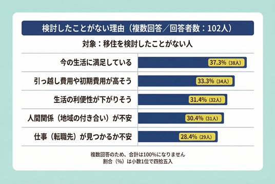 移住を検討したことがない人102人に理由(複数回答)を聞いたところ、最多は今の生活に満足している37.3%(38人)でした。