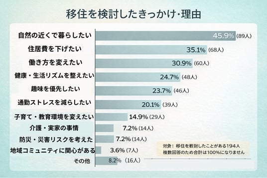 移住を検討したことがある人のうち、「気になって調べたことがある」~「移住したが戻った」を選んだ194人に、移住を検討したきっかけ(複数回答)を聞きました。