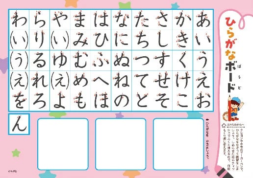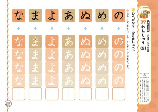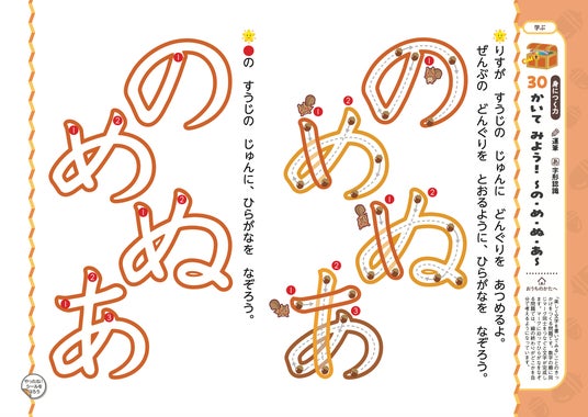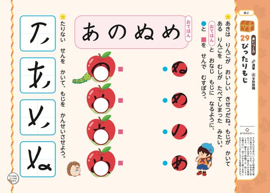 キャラクターといっしょに「季節の世界」を冒険しながら、ひらがなが自然と身につくように構成されたドリルです。