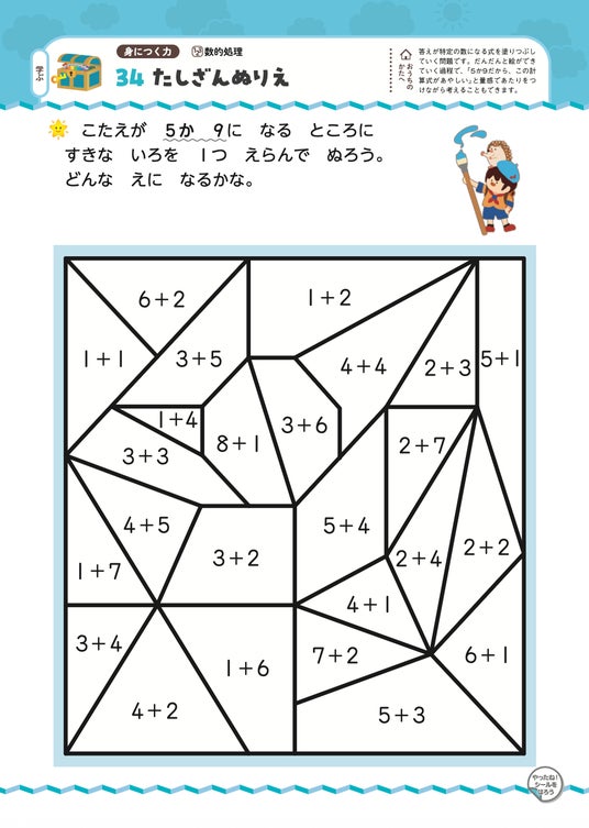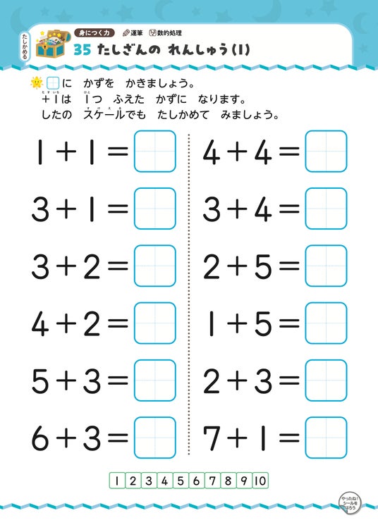 キャラクターといっしょに「動物の世界」を冒険しながら、「数」の概念とたし算の基礎が自然と身につくように構成されたドリルです。