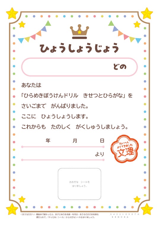 1冊が終わったらシールを貼る「ごほうび賞状」