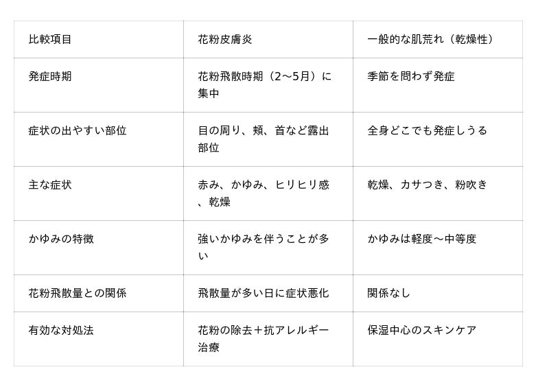 A. 花粉皮膚炎は花粉飛散時期に目の周りや頬など露出部位に集中して症状が出る点が、季節を問わない一般的な肌荒れと異なります。
